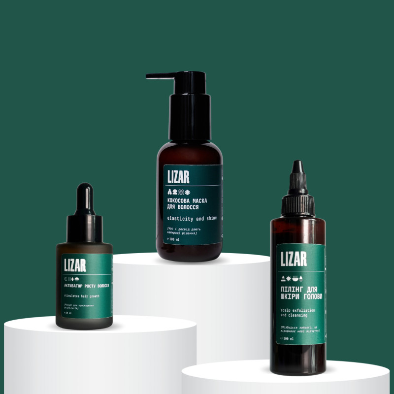 В наборі: Пілінг для шкіри голови 100 мл., Кокосова маска з аюрведичними травами 100 мл., Активатор росту волосся 30 мл.