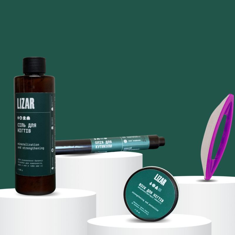 В наборі: Сіль для ванн для нігтів, Віск для запечатування і зміцнення нігтів, замшевий бар, апельсинові палички, Олія для кутикули